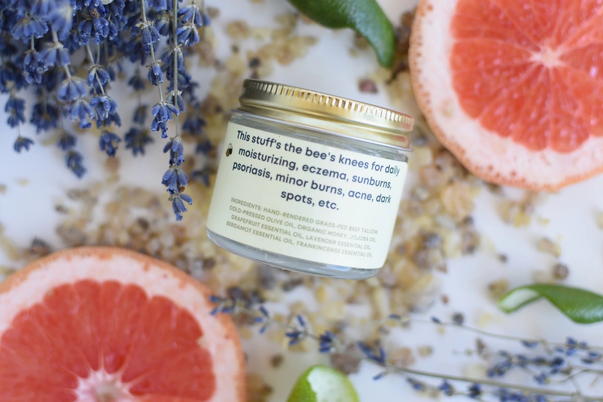 ***INGREDIENTS: Hand-rendered beef tallow, cold-pressed olive oil, organic honey, jojoba oil, grapefruit essential oil, lavender essential oil, bergamot essential oil, frankincense essential oil.